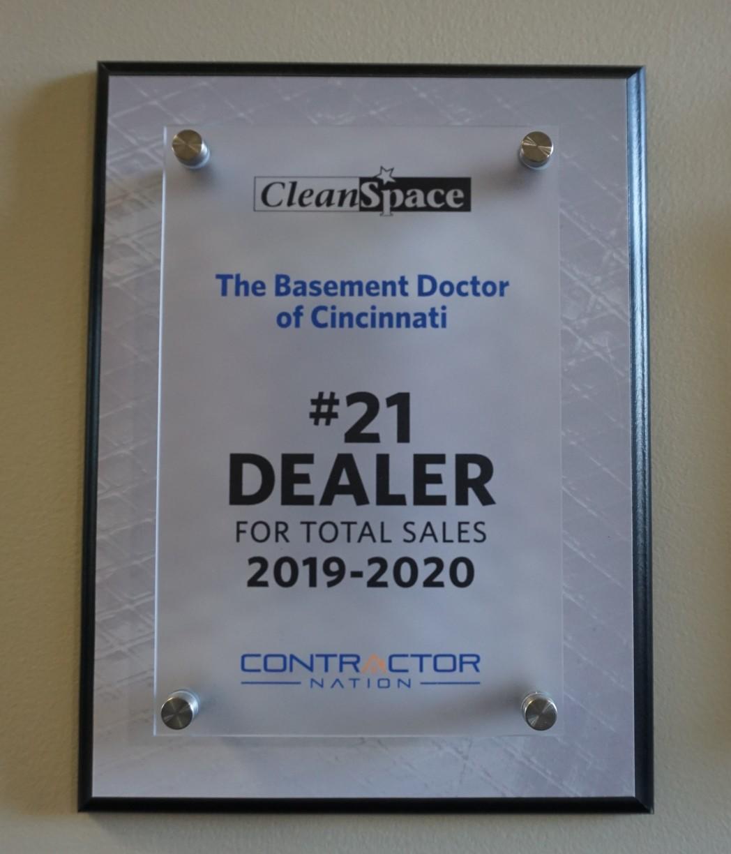 For the 2019-2020 year, the Basement Doctor of Cincinnati was ranked #21 out of hundreds of dealers for CleanSpace sales.