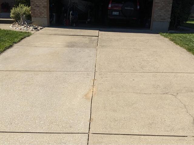 We repaired this driveway in Florence, KY, by leveling out all the slabs with our PolyLevel foam injection system. By drilling tiny holes through the settled slabs and then injecting our special foam underneath the driveway through the holes, we were able to perfectly realign the concrete driveway. After making the driveway plum again, we then finished the project by sealing all the control joints and the hairline cracks with our NexusPro sealant. The homeowner told us that they didn't realize how much of an effect the process would have on the curb appeal of their home.