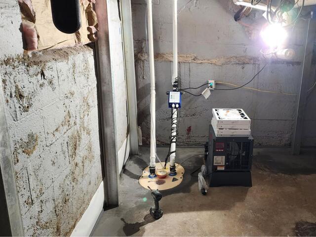 This homeowner in Bellbrook, OH, was in need of a sump pump upgrade because their current sump pump could not keep up with the amount of water their foundation was receiving. Their existing exterior french drain system was still working, but the sump pump couldn't keep up with it. We replaced their sump pump with our premier TripleSafe sump pump system. As the name implies, the Triple safe comes with three pumps: The primary is a Zoeller 1/3 HP, the secondary is a Zoeller 1/2 HP pump, and the tertiary pump is our UltraSump battery backed system. The battery backed system, (which turns on in case of power outage or if the first two pumps are overpowered) can pump out 11,500 gallons of water on a full charge by itself. The TripleSafe also has a proprietary airtight lid, which contains an airtight floor drain and an alarm system. The homeowner was pleased with the new system, and they told us they would give us a call if their current footing drainage system fails.