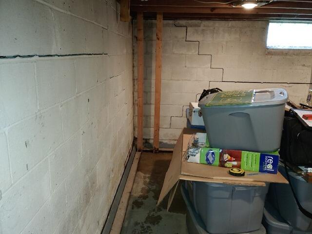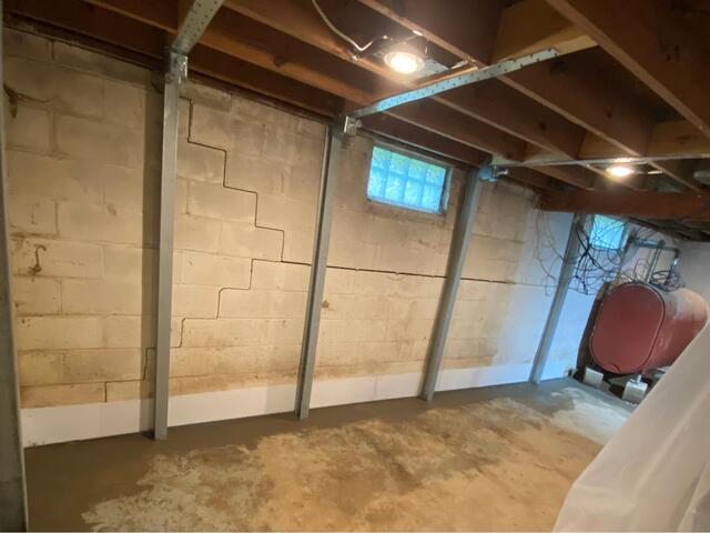 The crack you can see from the "before" picture from this basement in Goshen, OH, is very common. When a block wall experiences lateral movement, it will first start to crack in a horizontal line right near the frost line is in the outside soil. In the later stages of development, the crack will then expand to both corners of the wall in a stair-like pattern. Although a quite scary crack, we have seen it thousands of times and have repaired it thousands of times with our PowerBrace system. Our PowerBraces are made of steel and are coated in zinc to prevent rusting. They also have specially designed brackets at the top to prevent floor joist damage, and these brackets allow us to potentially straighten out the wall again through annual adjustments. The homeowner was relieved to know that we've seen this crack thousands of times, and that we were able to install a full-proof system.