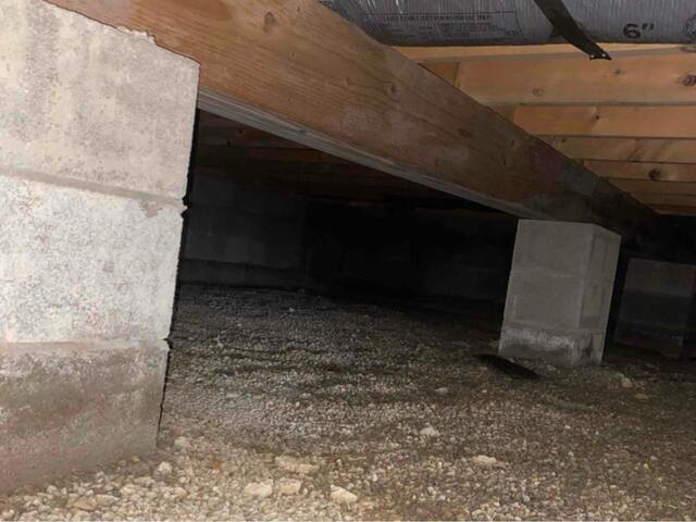 This crawl space had gravel all along the floor, which is better than dirt, but still not good enough to skip a moisture barrier. We installed CleanSpace liner across the whole crawl space to keep moisture out, saving the wooden beams from rot. The liner also keeps moldy air out and helps insulate a bit.