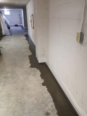We installed an interior waterproofing system for this basement in Amelia, OH, to keep the space dry and healthy. We started by covering the vents, the furniture, and any other items we didn't want to get dirty with a plastic shield. We then began jackhammering the floor around the perimeter of the basement - distanced about a foot in from the walls to make room for our patented WaterGuard drainage system. Next, we dug a hole in the lowest graded part of the basement floor to make room for our TripleSafe sump pump catch basin. We then began fitting the trenches with our subfloor drains, a trench drain (for the walkout stairwell door), and we also plumbed together the sump pump system. To finish up the project, we concealed all the drains with a fresh layer of concrete, which is why the perimeter of the basement floor looks wet in the pictures below. The customer was super happy with how non-invasive the install was to their home, especially with how quickly the project was completed.