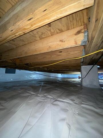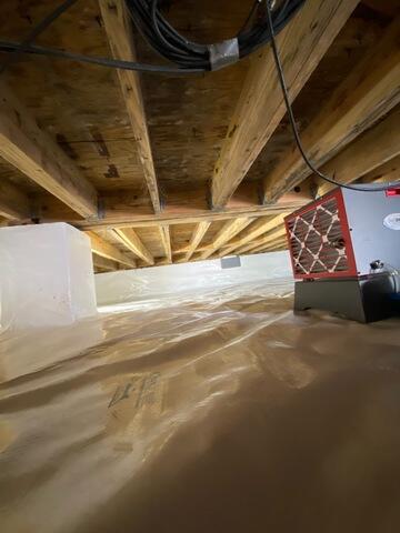 Our inspector went out to this crawl space in Aurora, IND, to give the owners of the crawl space a free estimate to encapsulate it. When our inspector went to get humidity readings in the space, the relative humidity read at 50.3%, which is actually pretty good, (mold begins to grow at 60%). However, this reading was taken early in April where the temperature outside was only 52 degrees F, and as we all know, when the summer heat hits, RH's in crawl spaces rise drastically. The homeowner wanted us to encapsulate it before the summer, so we did just that. By covering the space with our durable, moisture-proof, antimicrobial CleanSpace liner, the crawl space was ready for the summer. (Not pictured is the SaniDry Sedona dehumidifier we also installed.)