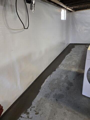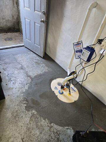 We waterproofed this leaky basement in Cleves, OH, by installing our interior waterproofing system. We started by installing our WaterGuard subfloor drains underneath the floor around the perimeter of the basement. We then installed a trench drain right outside the basement in the stairwell along the base of the walkout door. We then installed a TripleSafe sump pump in the basement, which is our most secure sump pump system by containing three different pumps inside its liner. This sump pump system is also backed up by a battery backup system to provide power in case of a power outage. After installing the sump pump, we then covered the walls with our CleanSpace vapor barrier to brighten and freshen the space up. Lastly, we finished the project by tucking the vapor barrier into the subfloor drainage system, and then covering the subfloor drainage system with a fresh concrete float to conceal it. The homeowner was very happy with the outcome - a dry, clean basement safe from water.