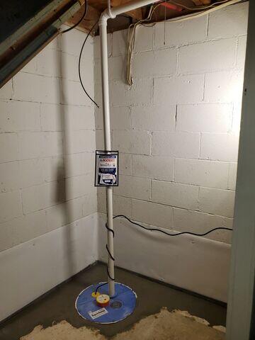 To solve the problem, our crew installed about 15 feet of WaterGuard along the inside perimeter beneath the staircase. This interior drainage system will collect water that enters the basement and direct it safely to a sump pump. For pumping power, we installed a SuperSump system, which provides reliable protection during heavy rains and high water tables.