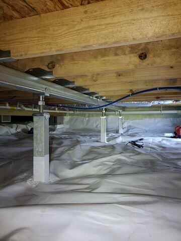 Our team installed 18 SmartJack support posts along with two new steel main beams to permanently stabilize the floor system. The SmartJacks are fully adjustable, allowing us to lift the floors back toward their original position while providing lasting support. To further improve the crawl space, we encapsulated the floor with a CleanSpace vapor barrier, protecting the area from ground moisture and creating a cleaner, drier environment.