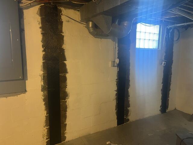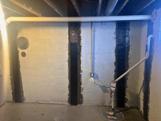 During our inspection, we found that the foundation walls were bowing inward and were actively moving. To stabilize the structure, we installed CarbonArmor wall straps, which provide strong, long-term support to prevent further inward movement. We also replaced the homeowner’s broken sump pump with our SuperSump system, ensuring reliable water removal and connecting it to the existing exterior French drains for optimal drainage away from the foundation.