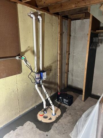 Our crew installed a full-perimeter WaterGuard drainage system to capture and redirect water before it could spread across the basement floor. To address the wall cracks, we applied BrightWall crack covers, which not only seal the cracks but also channel any seepage directly into the WaterGuard system. For pumping power, we installed a TripleSafe sump pump. This system provides three levels of protection: a primary pump, a secondary pump for backup, and a battery-powered pump to keep the basement dry even during power outages.