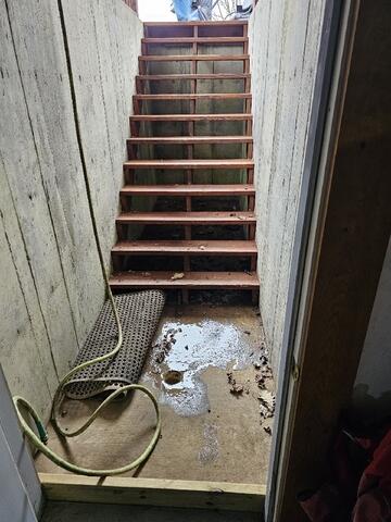 This basement in Warsaw, KY, had a leaky stairwell, so we waterproofed it for the homeowner. We installed a drainage system in the stairwell with a trench drain (not pictured) and then hooked the drainage system up to a TripleSafe sump pump system. The sump pump will then discharge the water far and away from the foundation through a discharge line. The discharge line features our white IceGuard outlets at the base of the home, which will allow water to overflow from the line if it were ever to freeze underground in the winter. The end of the line features our green popup outlet, which hides well in their yard. This homeowner no longer has to worry about water rushing in down their stairwell and into their basement.