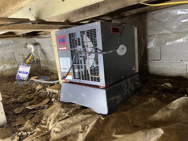 We installed a dehumidifier and a sump pump to better control moisture and water for this crawl space in Williamsburg, OH. Our SuperSump was hooked up to our perimeter drainage system in the floor of the space. These perforated drains were backfilled with gravel to better control the grading of the system, and to better filter soil and mud. Our SaniDry Sedona dehumidifier will help better control the humidity levels in the space, as it is capable of removing 99 pints of water out of the air in a day.